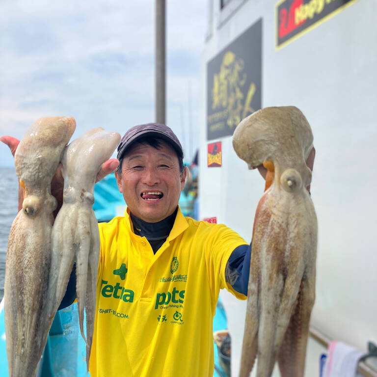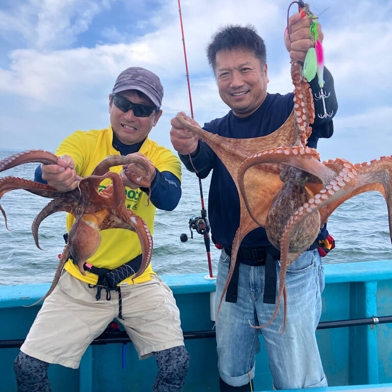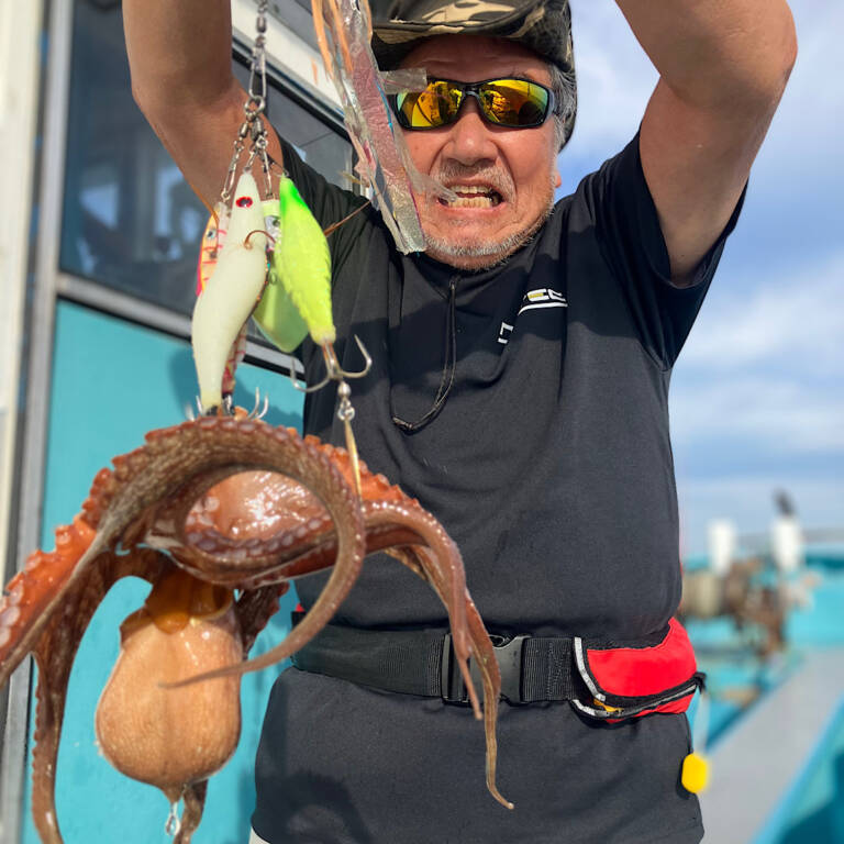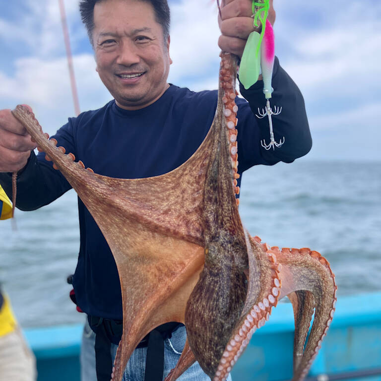 タコ釣り!2025年8月8日 2025年08月08日(金) 風が強くやりづらい中でしたが、ぽつぽつとアタリが🤩そこそこ揺れるので、巻き巻き中のバラシも多めでしたが…💦 サイズは相変わらずの小さめメインでしたが、久しぶりにデカタコも登場しました🙌しかもお隣さんでダブルヒット✨🐙🐙✨ 終盤戦はこのデカタコに期待したいんです✊もっと増やしたいですねー 本日の皆さん、ご乗船ありがとうございました🙇♂️まだまだタコ釣り出船します!ご予約お待ちしております☎ 釣果